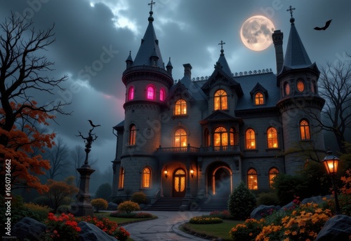 imagine a spooky halloween mansion blending fantasy and horror with twisting towers glowing magical crystals swirling mist dark gardens shadowed corridors flickering lights enchanted statues ghostly c