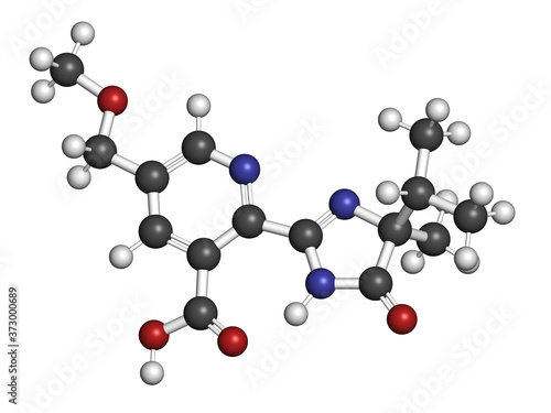 Imazamox herbicide molecule. 3D rendering. Atoms are represented as spheres with conventional color coding: hydrogen (white), carbon (grey), nitrogen (blue), oxygen (red).