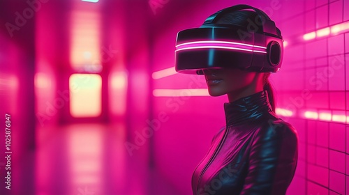Immersed in a cyberpunk virtual reality world, a woman wearing a headset explores neon lit digital realms; immersive experience in a simulation; technology for scifi cyberspace