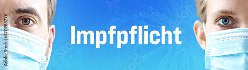 Impfpflicht. Gesichter von Mann und Frau mit Mundschutz. Paar mit Masken vor blauen Hintergrund mit Text