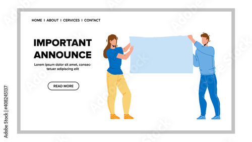 important, announce, placing, man, woman, vector, blank, canvas, banner, information, holding, businessperson, character, office, employee, web, flat, cartoon, illustration, poster, people, public, signs, social, message, signboard, mobile, site, landing, page, website, layout, template, note, notice, notice board, notification, announcement, publish, memory, reminder, businessman, advertisement, urgency, promotion, news, newsletter, communication, attention, importance