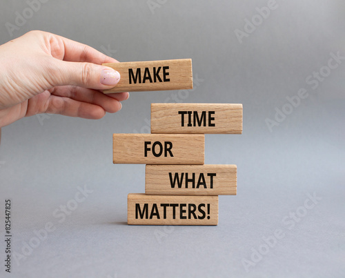Important thing symbol. Wooden blocks with words Make time for what matters. Businessman hand. Beautiful grey background. Business and important thing concept. Copy space.
