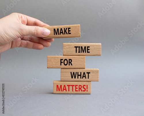 Important thing symbol. Wooden blocks with words Make time for what matters. Businessman hand. Beautiful grey background. Business and important thing concept. Copy space.