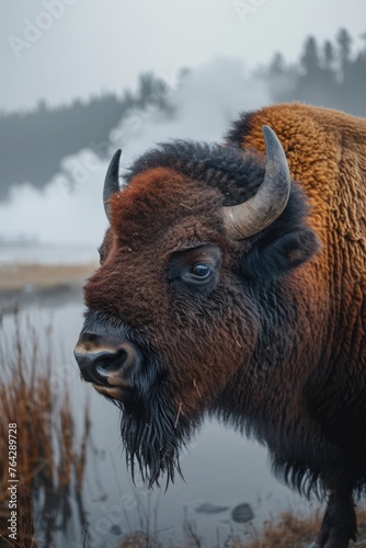 wildlife, bison, buffalo, portrait, closeup, intense, gaze, shaggy, fur, snow, winter, majestic, powerful, animal, wilderness, nature, cold, eye, sturdy, rugged, strong, solitary, undomesticated, power, strength, endurance, survival, conservation, species, large, horned, mammal, imposing, grandeur, stoic, resilient, wild, leadership, dominance, iconic, resilience, behemoth