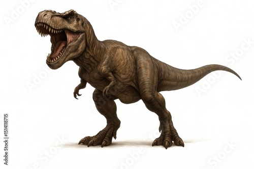 Imposing full-body illustration of a Tyrannosaurus Rex the king of dinosaurs roaring fiercely with sharp teeth and powerful legs isolated on a clean white background