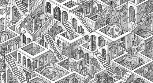 wallpaper, seamless pattern, architectural, labyrinth, stair, intricate, hand-drawn, plant, insect, cell, interlocking, complex, monochromatic, black-and-white, line art, detailed, drawing, vignetting, conceptual, abstract, art, graphic design, textile design, background, paradox, optical illusion, mesmerizing, unique, creative, organic, nature, biology, microscopic, fantastical, surreal, smart, clever