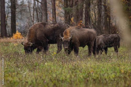 impressive giant wild bison grazing peacefully in the autumn scenery