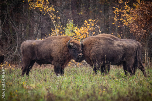 impressive giant wild bison grazing peacefully in the autumn scenery