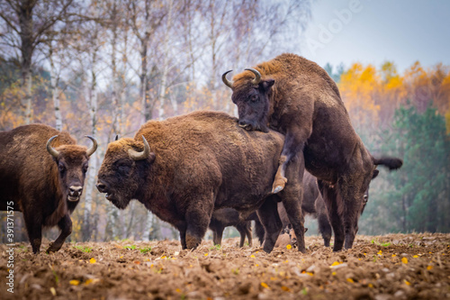 impressive giant wild bison grazing peacefully in the autumn scenery