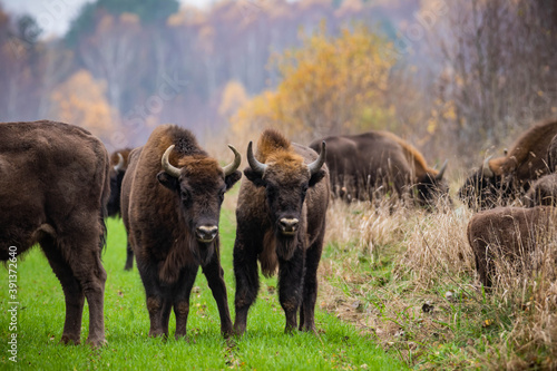 impressive giant wild bison grazing peacefully in the autumn scenery