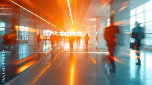 In a busy work environment, the bright office floor is blurred with motion