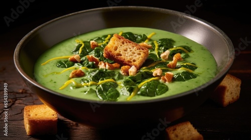 In a ceramic bowl, a velvety spinach soup is served piping hot. The vibrant green hue is complemented by a garnish of crispy croutons, adding both visual appeal and a satisfying crunch to