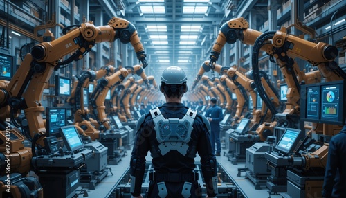 In a cutting-edge factory, advanced robotic arms collaborate seamlessly with human operators, showcasing futuristic technology and the harmony of automation