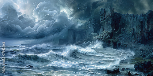 storm, wave, highland, windy, sea, cloud, sky, digital, painting, fiery, tranquil, landscape, rugged, terrain, nature, serene, dramatic, weather, natural, wild, environment, outdoors, scenic, cloudscape, evening, wilderness, water, climate, ocean, seascape, lightning, danger, art, thunder, power, turbulent, atmospheric, dark, powerful, wind, marin, night, illustration, artwork, fantasy, background, wallpaper