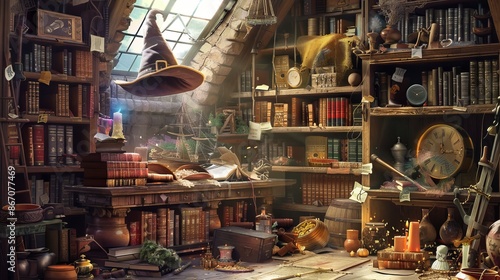In a dusty attic, a child's imagination soars amid old books and treasures--a pirate's hat, a wizard's wand.