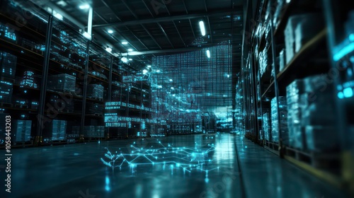 In a logistics center, supply chain network diagram is projected holographically with dynamic and dramatic compositions, including stock copy