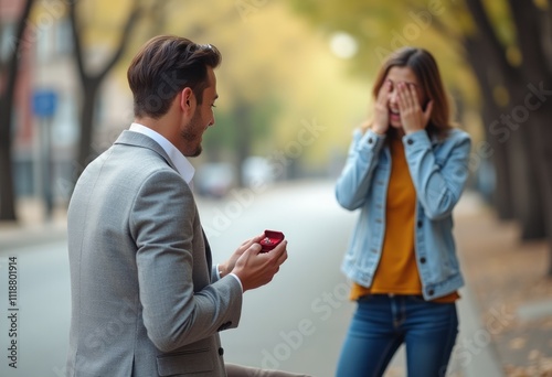 proposal, love, surprise, engagement, autumn, happiness, joy, couple, ring, emotion, disbelief, romance, street, tree, celebration, kneeling, human relationships, togetherness, excitement, affection, intimate, bliss, heartfelt, moment, commitment, engagement ring