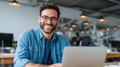 In a stylish, up-to-date office environment, a happy businessman grins as he focuses on his open notebook device