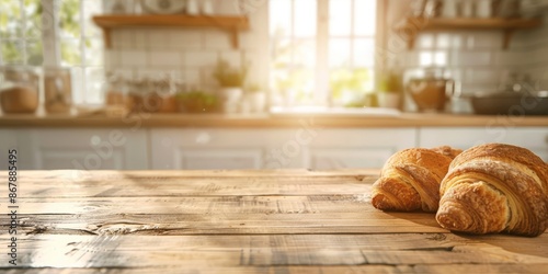 In a sunlit kitchen, there are fresh croissants on a wooden counter, creating a peaceful morning ambiance