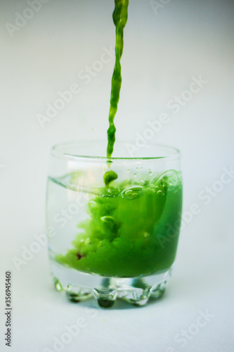 In a transparent glass with clean water, with cherries at the bottom, green paint is poured with a dynamic movement and colors the water green on a white background.