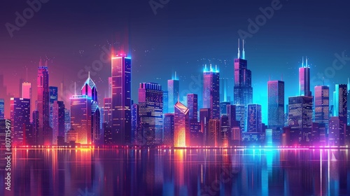 neon light, digital illustration, sunset, technology, modern architecture, skyline, city lights, advanced technology, digital artwork, metropolitan, science fiction, skyscraper, metropolis