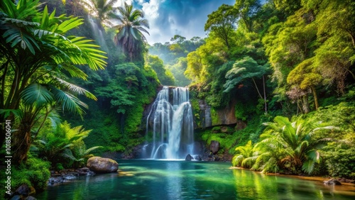 tropical, waterfall, nature, jungle, greenery, serene, cascading, paradise, landscape, forest, tranquil, water, rock, sunlight, scenic, ecosystem, wild, beautiful, exotic, environment, refreshing, blue skies, foliage, vibrant, peaceful, adventure, natural beauty, scenic view, cloud, wildlife, cascade, river, mist, summer, lush, travel, explore, escape, untouched, relaxation, harmony, ecotourism