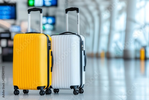 In an empty airport terminal, two traveler suitcases await their owners, embodying the vacation concept, with blank space for text or a design.