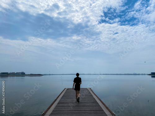 In the background of blue sky and white clouds, the back of a beautiful woman on the plank road on the lake surface