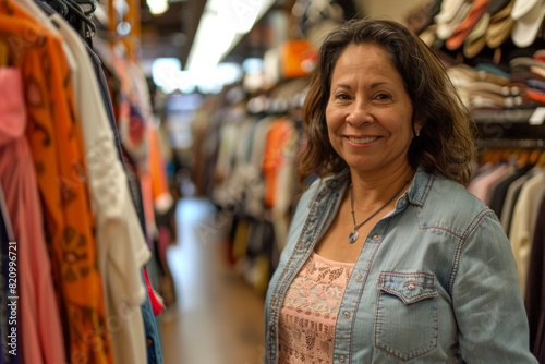 In the clothing store, a dedicated Latino saleswoman provides exemplary customer service with a genuine smile. She effortlessly navigates through racks of clothes, helping customers find the perfect