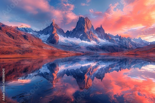 In the evening, the red sunset shines on the snow capped mountains and the reflection on the lake surface