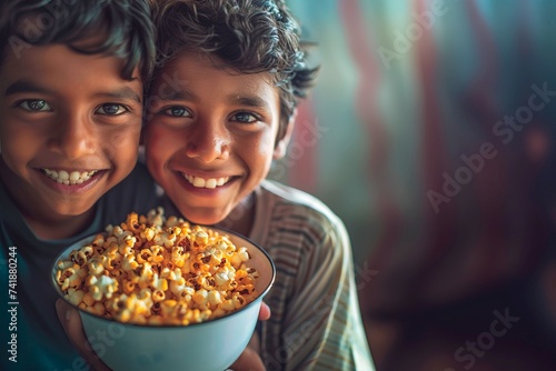 children, smiling, popcorn, happiness, sibling, bowl, snack, joy, cosy, togetherness, family, youth, cheerful, sharing, indoor, friendship, playful, fun, casual attire, enjoyment, portrait, home, warm colors, domestic life, food, tasty, treat, bonding, close, up, pleasure, leisure, delight, children, brotherhood, contentment, affection, grinning