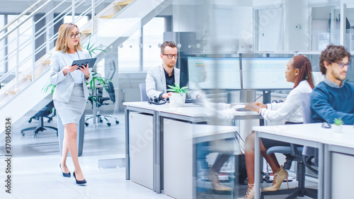 In the Modern Open Space Office Businesswomen Walking Through Hallway. Business people Working, Using Computers, Having Discussions, Finding Solutions and Working on Desktop Computers