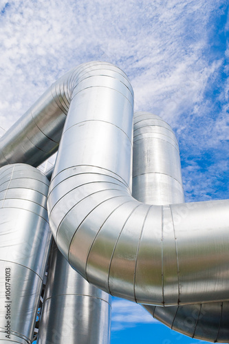 In the photo there is a pipeline and a metal ladder, in the background there is a blue sky and clouds