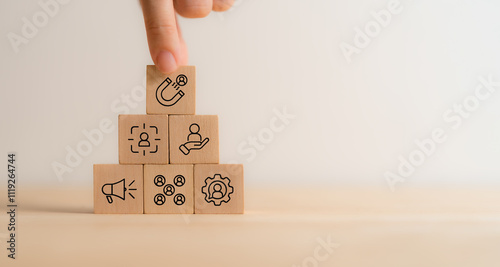 Inbound lead generation concept. Wooden blocks with leads and strategy icons. Building interest in a product or service and turning interest into a sale. The first step in a company's sales funnel.