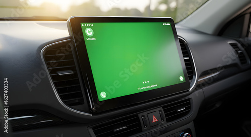 In-Car Connectivity: Modern Vehicle Infotainment System with a Customizable Green Screen Display and Mobile App Interface, Ready for Navigation, Communication, or Entertainment in a Sunlit Interior