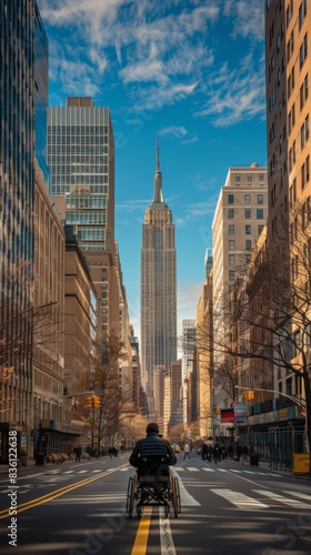 wheelchair, city, accessibility, urban, travel, skyscraper, street, journey, city landscape, transportation, mobility, independence, road, building, life, downtown, architecture, landmark, pedestrian, adaptive, equipment, view, empowerment, accessible, metropolitan, iconic, building