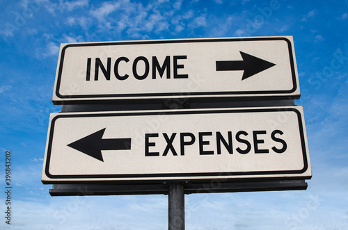 Income versus expenses road sign. White two street signs with arrow on metal pole with word. Directional road. Crossroads Road Sign, Two Arrow. Blue sky background. Two way road sign with text.