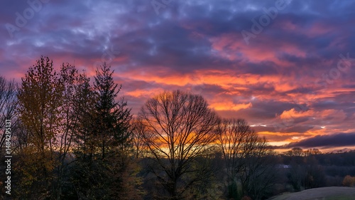 sunset, cloud, sky, orange, purple, colourful, tree, silhouette, landscape, nature, dusk, evening, horizon, light, glow, vibrant, atmospheric, weather, outdoors, scenic, beauty, magical, tranquil, serene, peaceful, breathtaking, picturesque, natural, environment, rural, autumn, foliage, bare trees