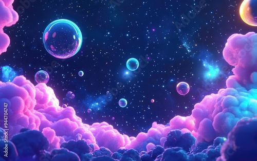 Incredibly beautiful galaxy in outer space with a 3D cartoon rendering Multicolored nebula night starry sky featuring planets and stars