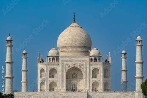 India. Uttar Pradesh state. Agra. Taj Mahal. White marble mausoleum built by the Muslim Mughal emperor Shah Jahan in memory of his wife Mumtaz Mahal. The Taj Mahal under a blue sky