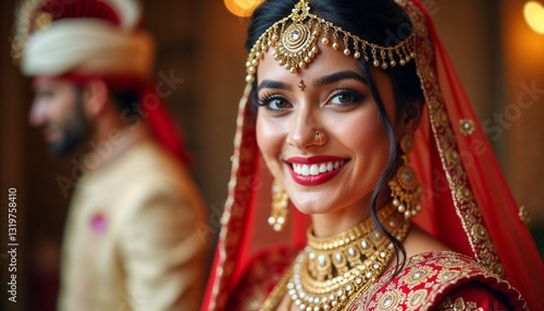 indian bride looking to the camera - smiling of joy - the groom is on the background partly blurred - portrait photography