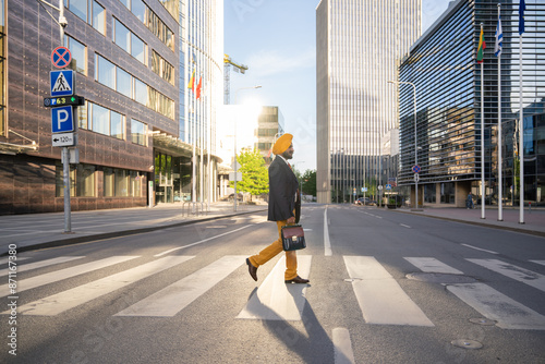 abroad, architecture, briefcase, business, businessman, city, clothing, copy space, crossing, crosswalk, elegant, entrepreneur, fashion, greenery, pursed, indian, jacket, lithuania, modern, business building, outdoors, pant, pedestrian, street, suit, summer, sunset, turban, urban, vilnius, walking, yellow
