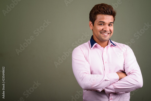 Indian businessman wearing pink shirt against colored background