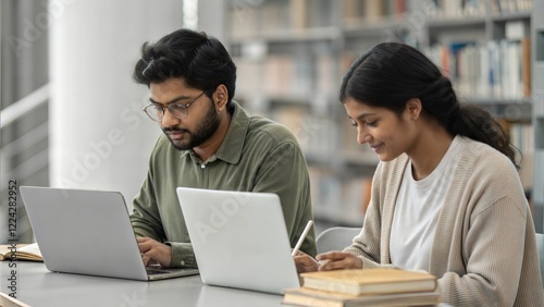 Indian college students studying together in a library, working on laptops and taking notes. The atmosphere is focused and collaborative, with books and notebooks scattered on the table.