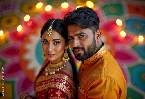celebration, festival, light, joy, happiness, couple, indian, traditional, attire, indoor, night, rangoli, decoration, culture, india, ethnic, festive, event, togetherness, bonding, love, tradition