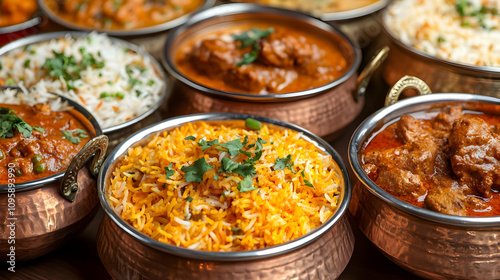 Indian Cuisine: Closeup of Yellow Rice and Curry in Copper Bowls
