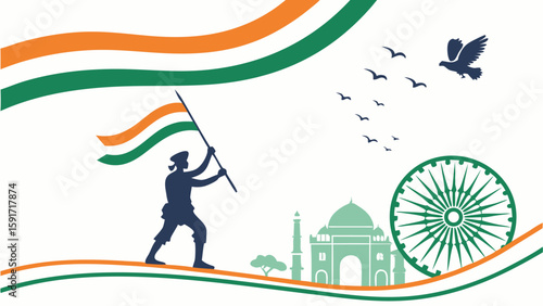 flag, indian, patriotic, silhouette, person, celebration, independence, national, pride, historical, landmark, mosque, chakra, colours, green, orange, white, design, illustration, graphic, symbol, vector, background, art, image