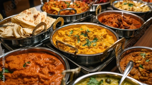 Indian food catering for corporate events, featuring a luxurious spread of curries, tandoori, and breads, beautifully presented in silver chafing dishes