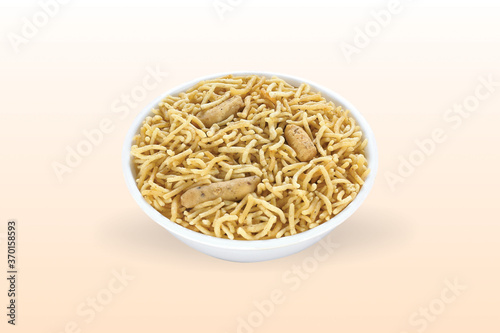 Indian Mathari made with fine wheat flour and namkeen Bikaneri Bhujiya made with chickpea flour (Besan), popular Indian snacks, Tasty namkeen Bikaneri Bhujiya made with chickpea flour, Bhujia sev