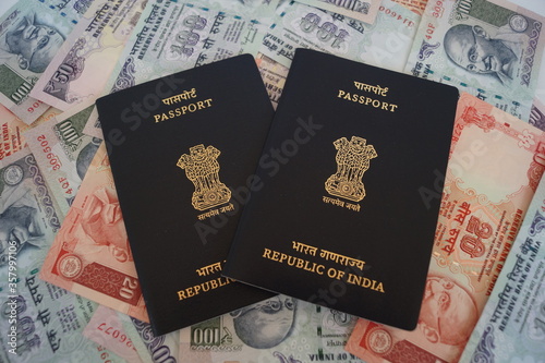Indian passport with currency as background